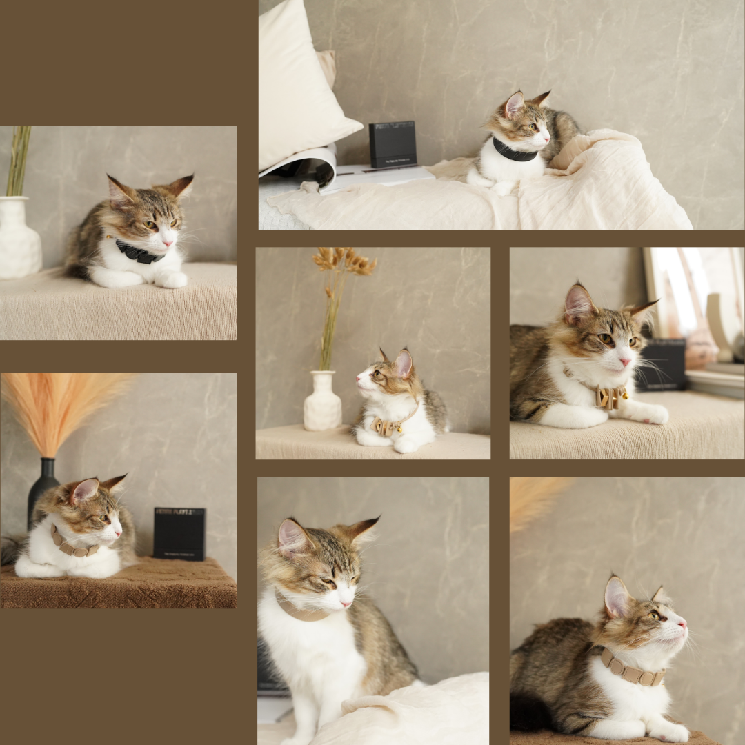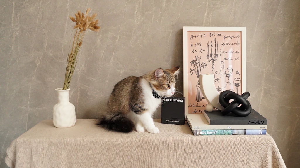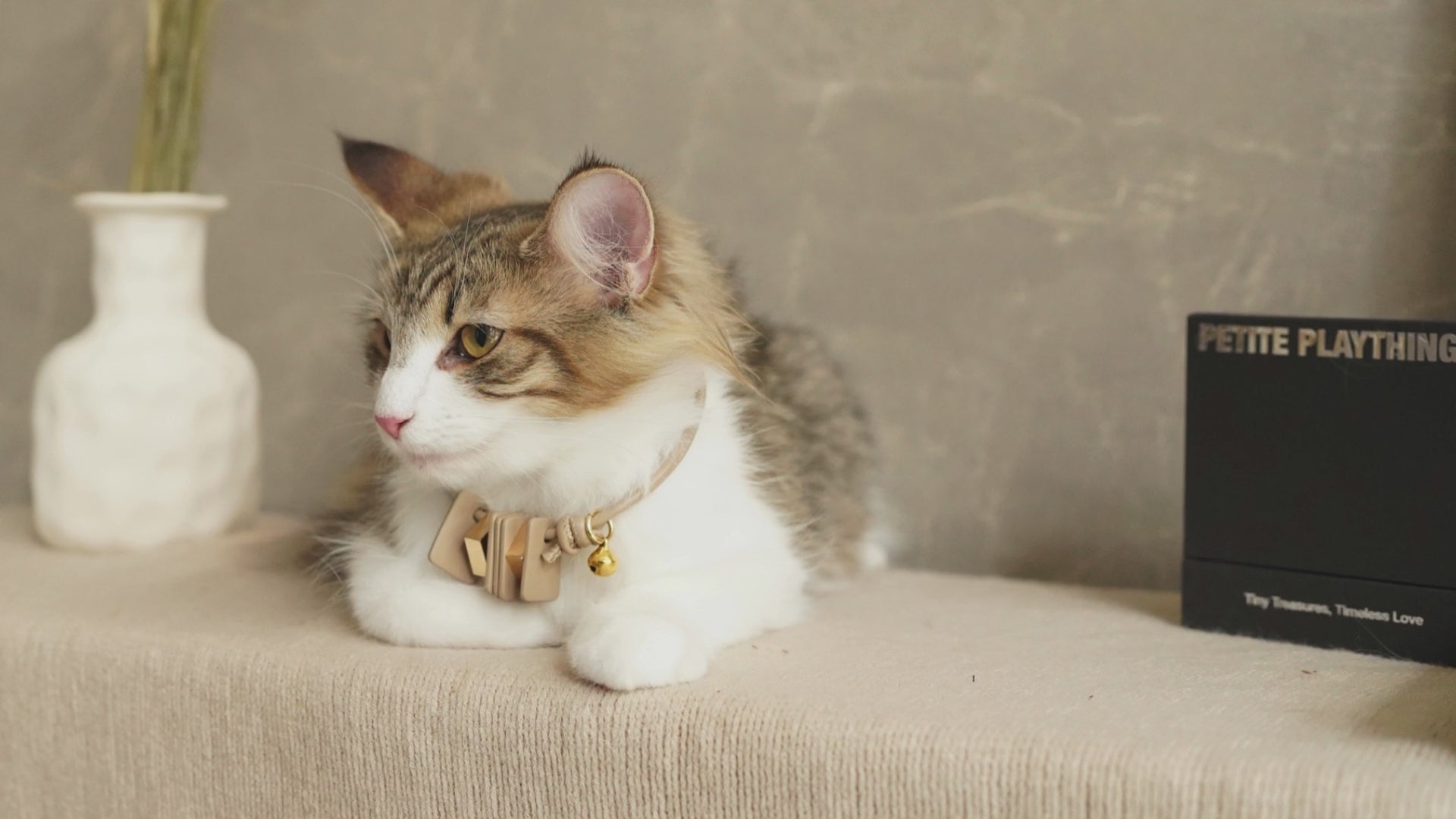 Petite Playthings' sculptural pet collars in calm, tonal settings. Worn by feline companions, each piece speaks to form, material, and intention with quiet presence.